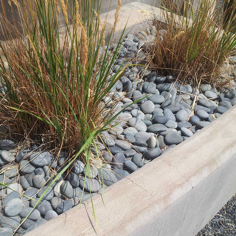 This cobble is a smooth, round, black/gray material with veins of white and brown. Commonly used for xeriscaping, water features, and flower beds. Available in a variety of sizes. Available in a variety of sizes. Note: We recommend seeing current inventory in person for darkness and sizing. The Mexican Beach Pebble line tends to vary in larger size than what it's listed at. We keep the sizing listed to what the supplier and other resellers call it to keep consistency in sizing for this product.
